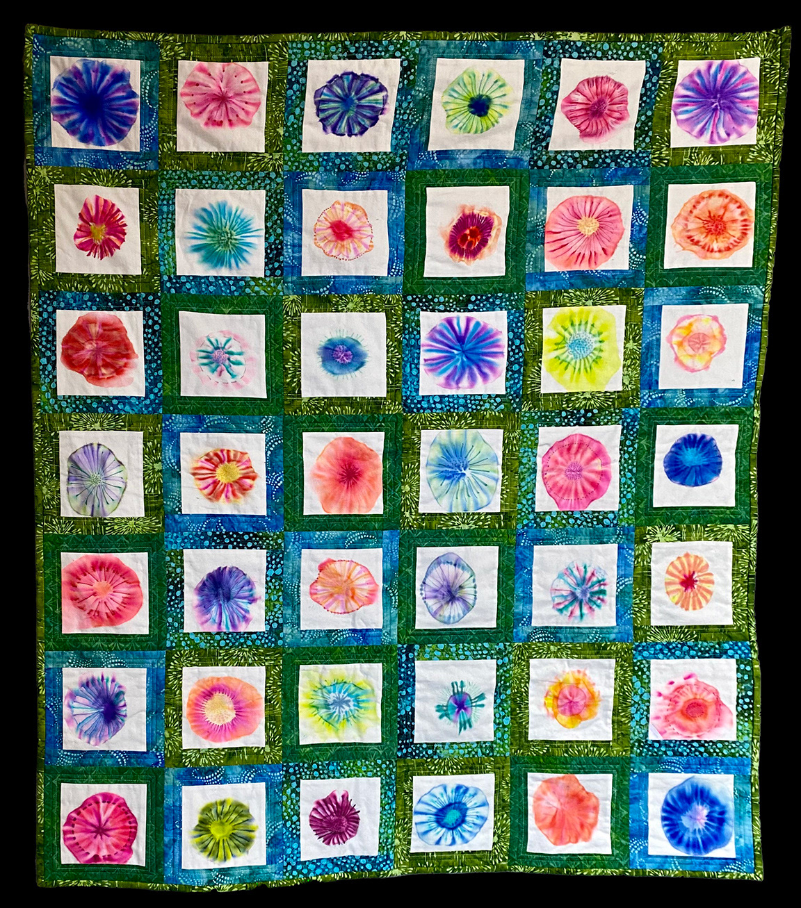 Fourth grade created these colorful, organic images using Sharpie and alcohol on fabric. It was part science experiment, part art. Susan Humm, grandmother of St. Clare students in 4th, 3rd and 1st grade offered her amazing quilting skills to tie them all together. But WHAT are they? That’s up to the viewer to decide. Flowers? Jellyfish? It’s up to you. The only thing we know for sure is that they are beautiful, whimsical and lovely. This piece is intended to be a wall hanging rather than a quilt as it is not washable. Dimensions: 38”Wx45”H