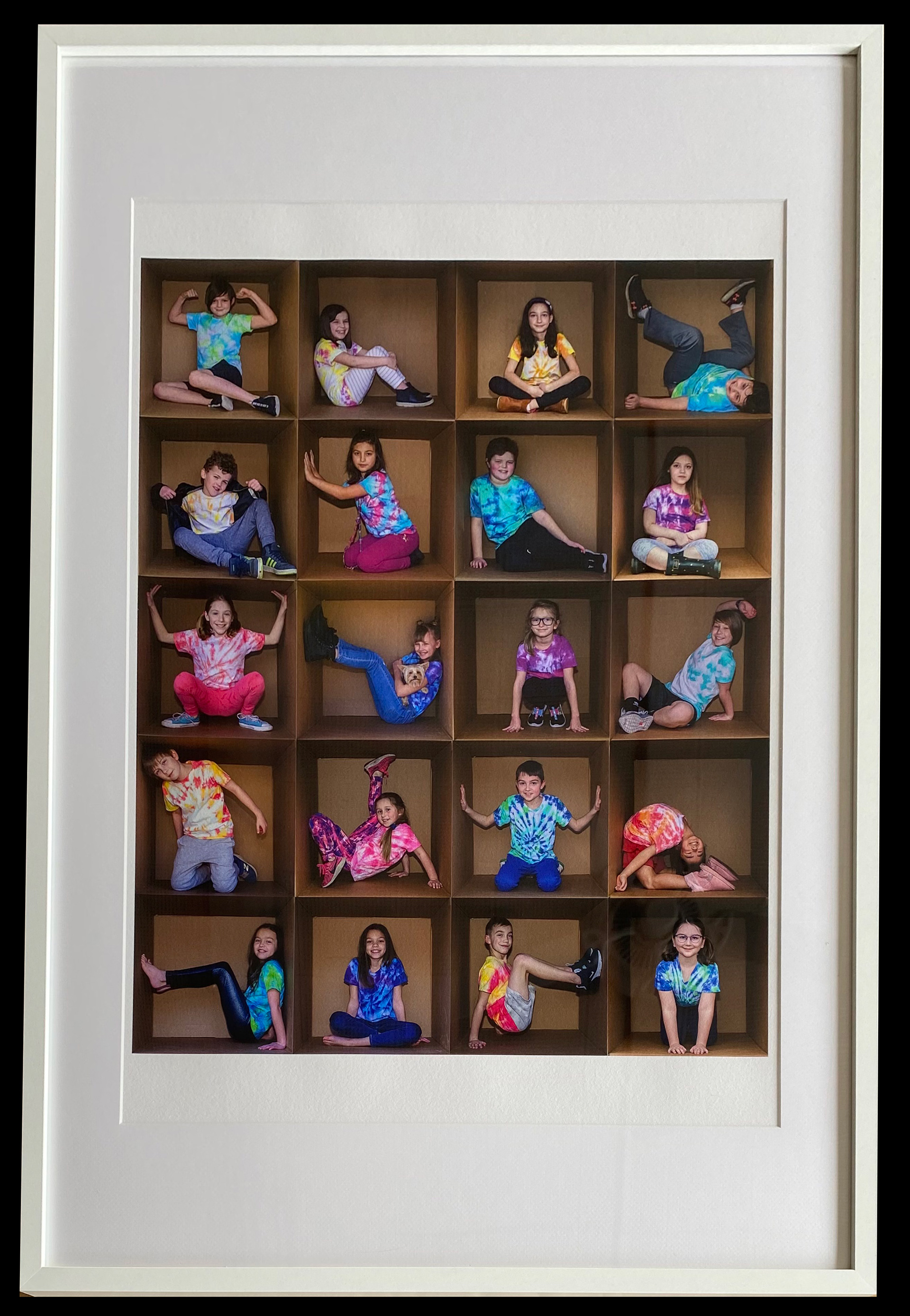 Third graders got to express themselves in more ways than one for this exciting piece! They tie-dyed their own t-shirts just for this project, then third grade mom Jamie Wegner took her mobile photo studio to each student’s house to take their portraits in the giant cardboard box. Each student chose their own pose based on their personality or whatever mood was striking them at that moment. Framed Dimensions: 24.75”x37.5”